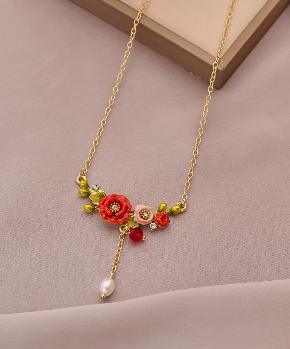 Beautiful Gold Sterling Silver Alloy Pearl Floral Tassel Pendant Necklace