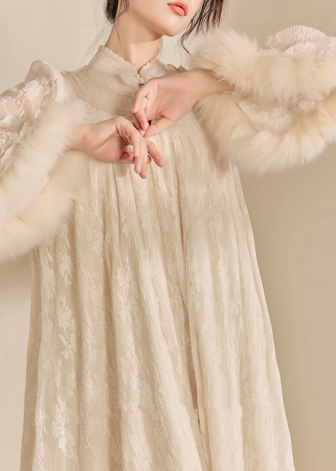 Chinese Style Beige Stand Collar Patchwork Button Long Dress Fall
