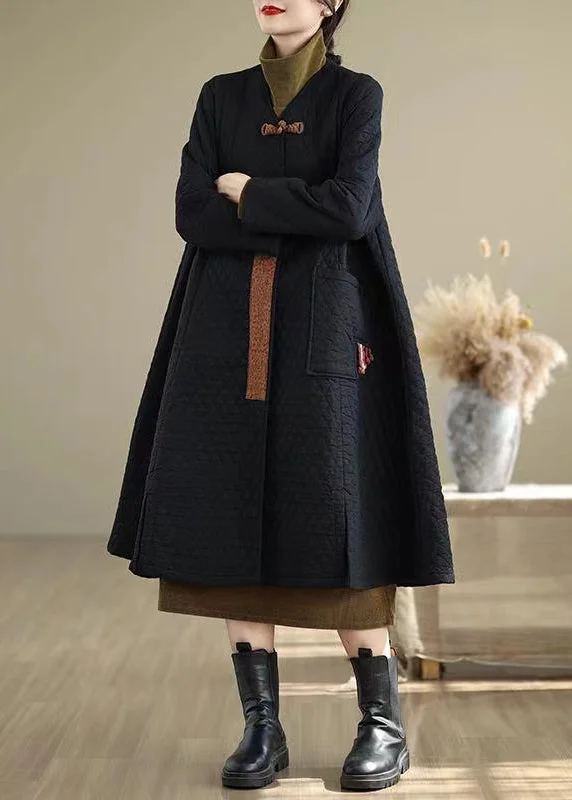 Chinese Style Black V Neck Pockets Fine Cotton Filled Winter Coats