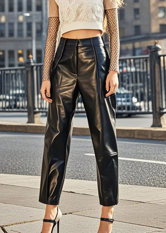 Classy Black High Waist Silm Fit Faux Leather Pants Spring