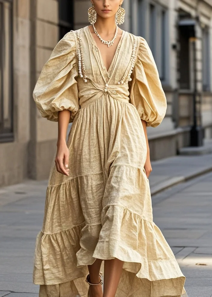Fine Khaki Nail Bead Exra Large Hem Cotton Dresses Lantern Sleeve