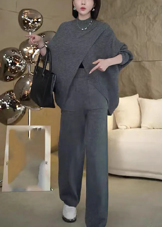 Loose Dark Gray Asymmetrical Sweaters And Pants Knit Two Piece Set Winter