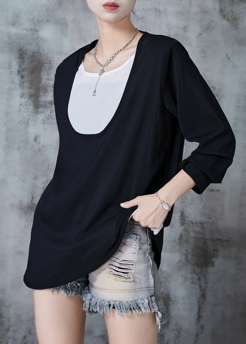 Modern Black U-Neck Patchwork Chiffon Fake Two Piece Top Fall