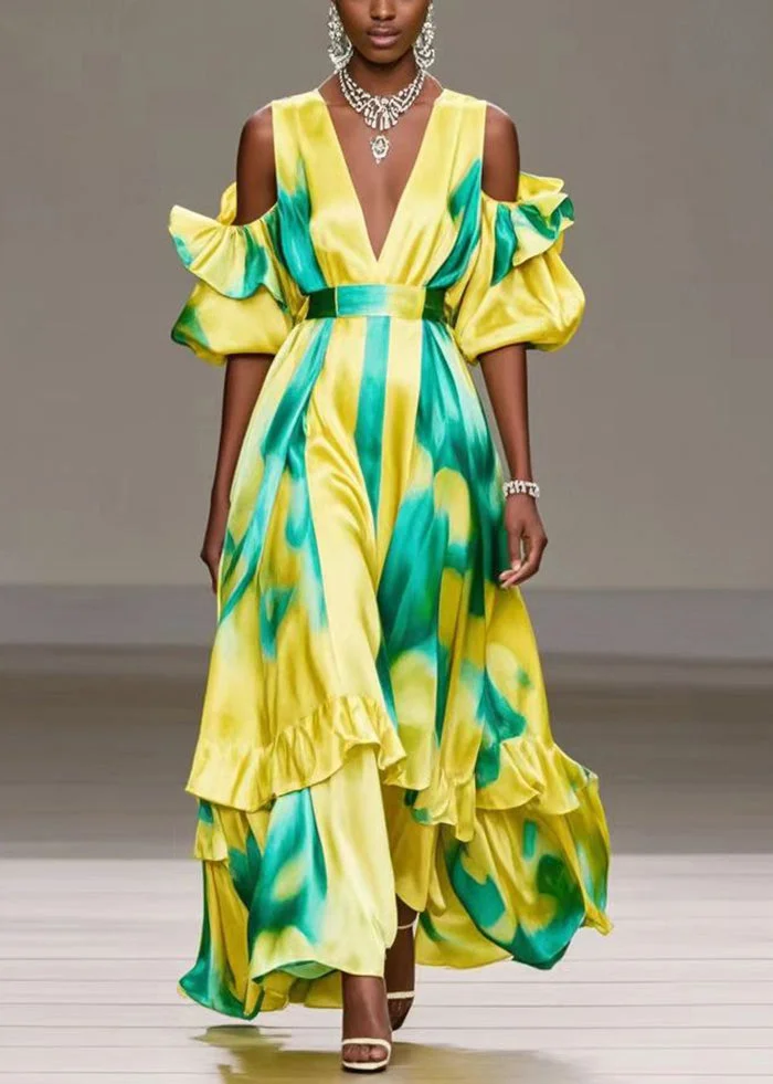 Customer ReviewsSimple Yellow Cold Shoulder Tie Dye Ruffles Silk Maxi Dress Summer