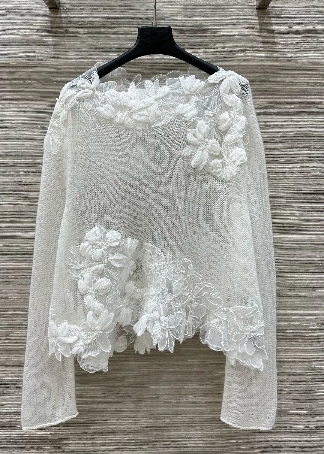 Stylish White O-Neck Floral Knit Shirt Tops Fall