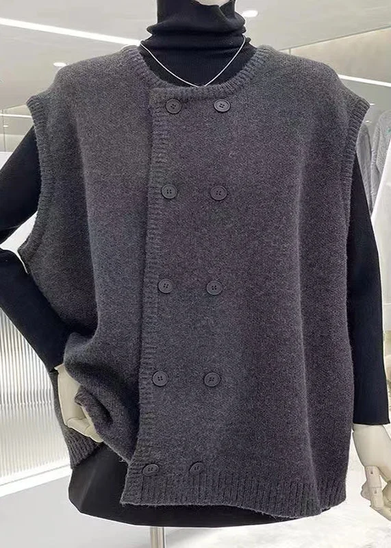Women Grey O Neck Double Breast Patchwork Knit Vest Sleeveless